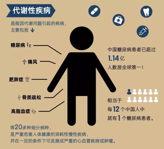 代谢性疾病是指因代谢问题引起的疾病,主要包括糖尿病、肥胖症、高脂血症、痛风、骨质疏松等20多种细分病种,是严重危害人体健康的消耗性慢性疾病,并在一定的条件下可发展成严重的心血管疾病或肿瘤。