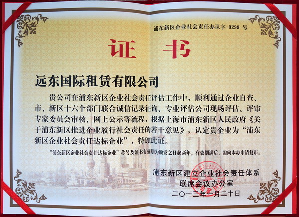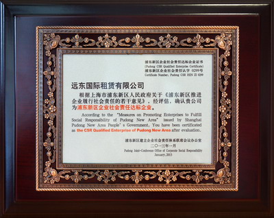 5月17日,浦东新区推进企业履行社会责任工作座谈会在浦东新区市民中心举行。远东国际租赁有限公司作为“浦东新区企业社会责任达标企业”应邀出席,并被授予了认定证书及奖牌。