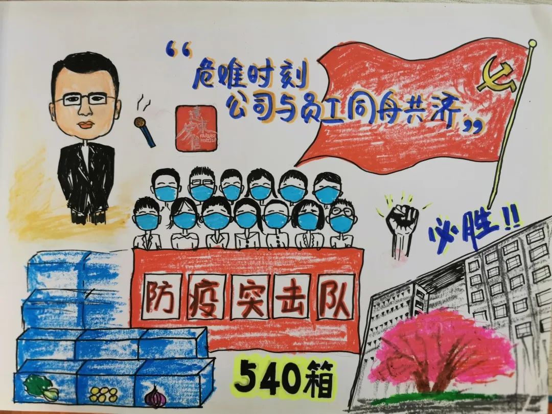 战略中心IT某员工:“足不出户的限制让我无法给公司同仁一个拥抱,仅以此画献给远东宏信领导和抗疫突击队员们,是你们的不眠不休,换来了我们踏实无忧的居家办公生活,是你们让每一位远东人心中充满了打赢这场疫情防控阻击战的必胜信心!”